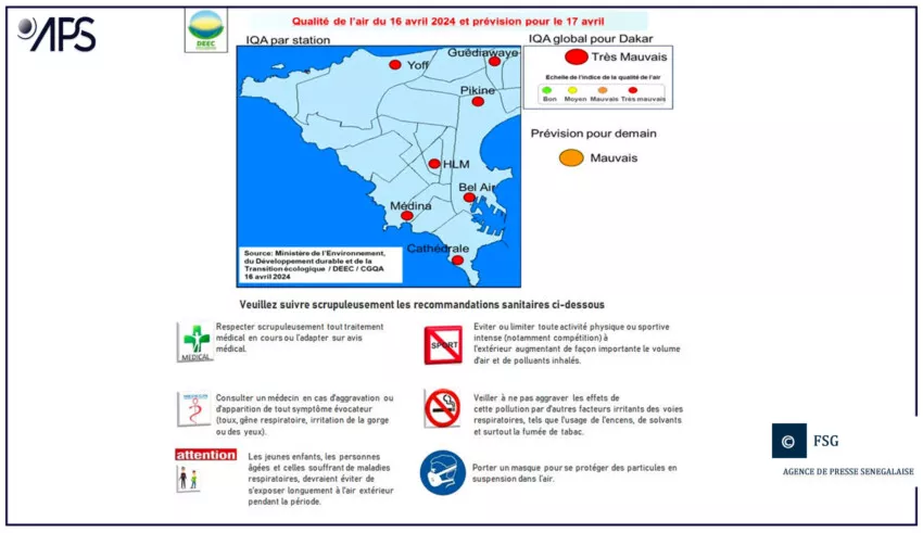 Les habitants de Dakar vont devoir affronter une atmosphère polluée durant les prochaines 48 heures. Le Centre de gestion de la qualité de l’air (CGQA) a émis une alerte orange concernant le niveau de pollution atmosphérique qui affectera la région mardi et mercredi. Les niveaux de particules nuisibles dans l’air avoisinent les seuils critiques. Le CGQA préconise la prudence, en particulier pour les populations à risque.